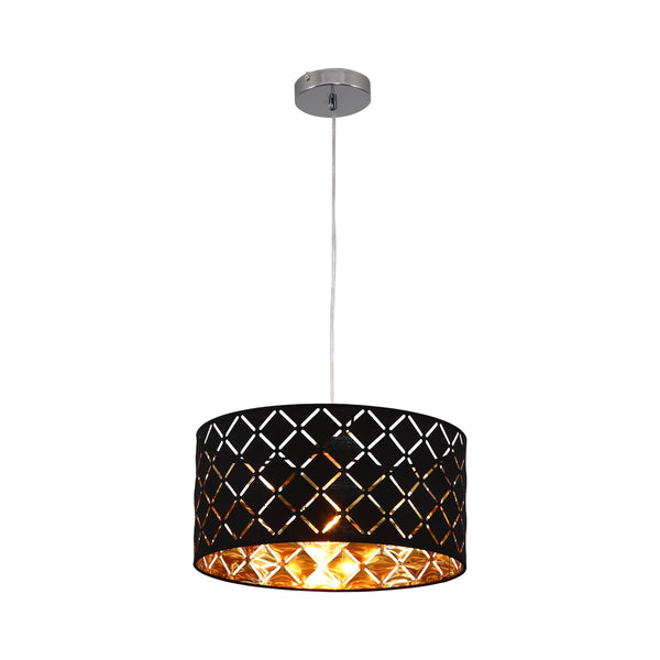 This stylish black and gold pendant ceiling light is perfect for adding a touch of elegance and sophistication to any room. Its cylindrical fabric shade features a unique diamond lattice cut-out pattern that creates a warm and inviting ambience when lit. The transparent cord adds to the light’s minimalist aesthetic, while the adjustable drop length offers flexibility.