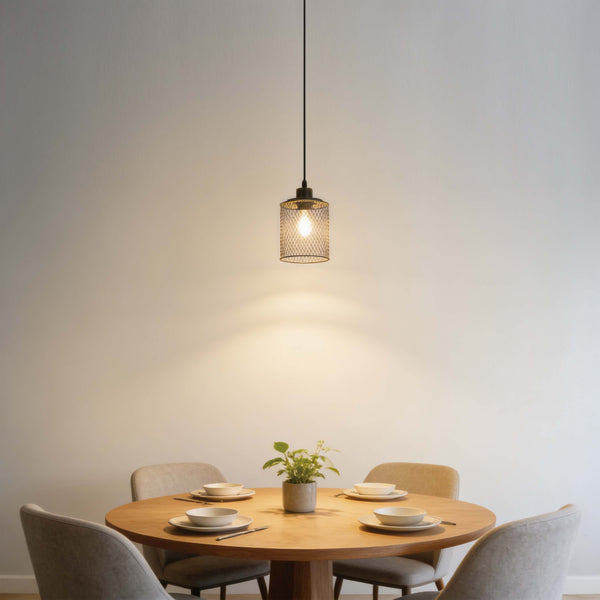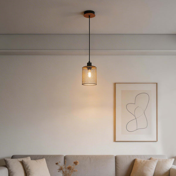 Introduce a perfect harmony of industrial edge and rustic warmth with our Industrial Mesh Cylinder Pendant Light. This eye-catching fixture features a finely crafted cylindrical wire mesh shade, topped with a smooth, natural wood accent. The mesh design not only provides a raw, modern aesthetic but also allows for a beautiful, diffused dispersion of light throughout your room.