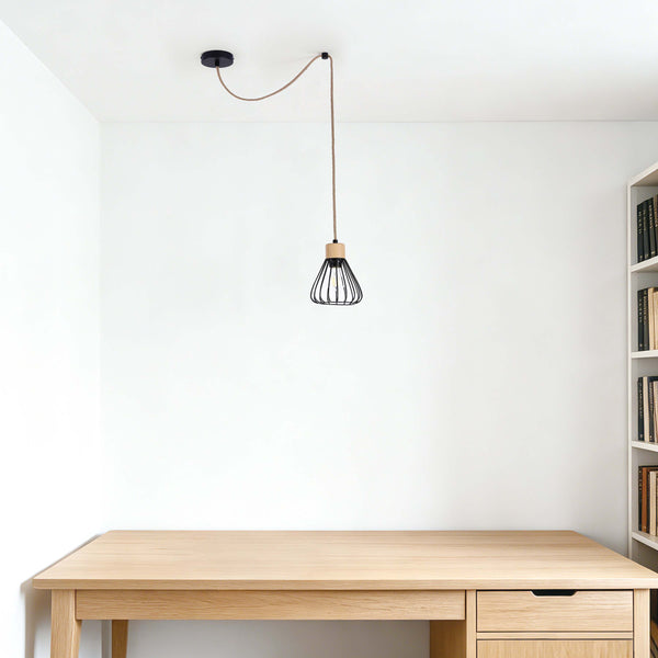 Infuse your space with a perfect blend of rustic charm and industrial edge using our Industrial Wire Cage Pendant Light. This striking fixture features a matte black open-wire cage that beautifully exposes the bulb, topped with a natural wood accent. The design is suspended by a robust, textured hemp rope, creating an authentic vintage aesthetic.