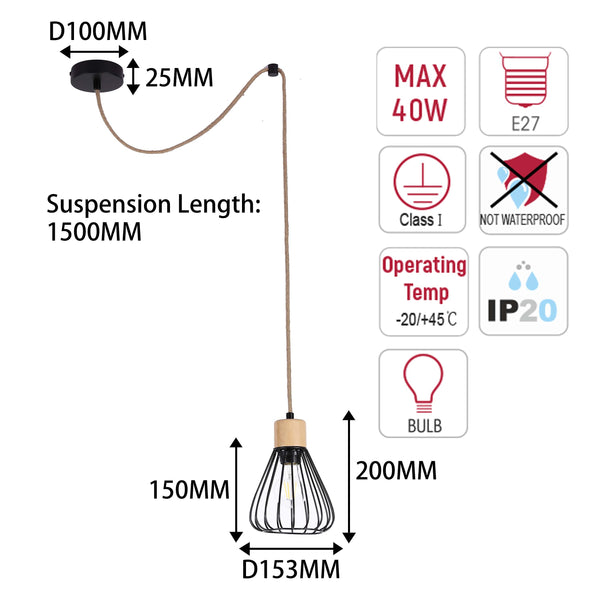 | Name | Industrial Wire Cage Pendant Light with Hemp Rope, E27 Dimmable |